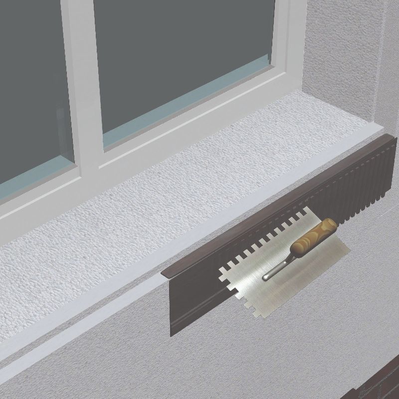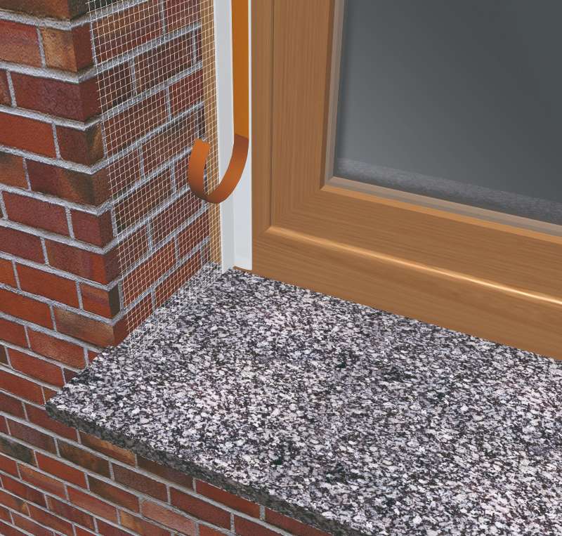 - Posicionar y embeber la malla del trozo de tira de Perfil Alféizar, previamente cortado a la medida exacta del hueco, sobre el todavía Rhona T-700 fresco. También se tiene que quedar adherido la parte de pvc del perfil, éste en la posición horizontal. Dejar secar el mortero adhesivo un mínimo de 24h.