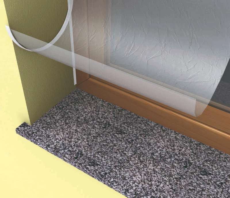 - Aplicar adhesivo Rhona T-700 sobre el alféizar de la ventana y retirar la cinta adhesiva de la espuma selladora; no de golpe, sino, poco a poco a la vez que se va pegando sobre la cara inferior del vierteaguas a instalar.
